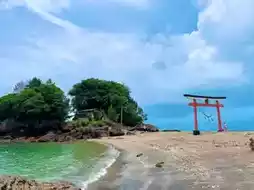 The approach to the shrine is a white sandy beach. The contrast of the blue sea, the torii gate, and the main shrine creates a picturesque view, almost like a painting✨. The appearance of the approach changes with the tides, and it is especially popular as a photo spot during sunset📸.