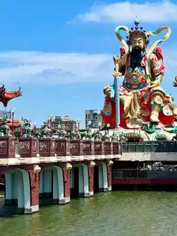 Then you've got the Spring and Autumn Pavilions, which are just as dramatic. They’re sitting right on the water, with this huge statue of Guanyin riding a dragon between them, super photogenic, especially at sunset.