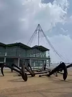 What an incredible maritime adventure! The first image showcases the “Wooyang Princess,” a massive cargo ship registered in Panama, gliding through Kaohsiung’s waters under a dramatic cloudy sky—its towering structure and intricate details are a testament to seafaring engineering. The second photo captures a charming train ride, likely near the Kaohsiung port area, offering a fun and scenic way to explore the surroundings with its classic red-and-black design against a bright, open plaza. The third image highlights a striking art installation of massive anchors outside a modern building, blending maritime history with contemporary design under a partly cloudy sky. Together, these scenes paint a vivid picture of Kaohsiung’s bustling port life, blending industrial might, tourist-friendly attractions, and artistic flair. A perfect mix of exploration and culture!