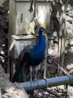 A blue peacock stood on the edge of a concrete platform, its plumage gleaming in the shadows of the trees. It doesn't constantly display its feathers, but an occasional call or a turn to display its back feathers creates a miniature performance.