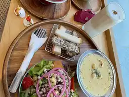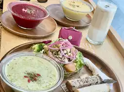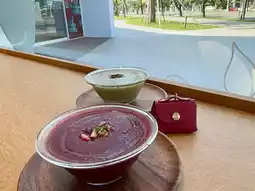 Today I went to SO_UP, a light food restaurant inside the Neiwei Art Center in Gushan District, Kaohsiung. It's perfect for a weekend stroll or a movie. The all-white design of the Neiwei Art Center is also perfect for photo ops! SOUP serves brunch from 8:00 AM to 5:00 PM. The staff are young, attractive, and friendly. I ordered a set menu with two soups. (Very Sponge Gourd Soup) Sponge Gourd, onion, shimeji mushrooms, and white fungus. (Corn, Rice, and Wheat Soup) Corn, oat milk, onion, carrot, garlic sprouts, and vegetable broth. (Beetroot and Apple Soup) Beetroot, apple, onion, tomato, eggplant, and celery. All very healthy. I finished three bowls of soup by myself. My favorites: the yellow (corn) for its texture, the green (sponge gourd) for its aroma, and the red (beetroot) for its nutrition. This is a great vegetarian restaurant and highly recommended.