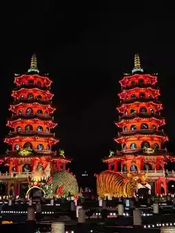 - Start your day with a visit to Lotus Pond (蓮池潭), one of Kaohsiung’s most famous landmarks. Walk around the lake and explore its colorful temples and pagodas — especially the Dragon and Tiger Pagodas, where you can walk in through the dragon’s mouth and out through the tiger’s to bring good luck.