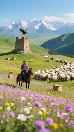 On the right, a vast mountain flower grassland stretches for hundreds of miles, Kazakh herders ride horses driving sheep through a sea of wild poppies;