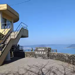This is on a hill, so you can see the ocean. It is a highly recommended spot. There is a shrine nearby, and you can see a large torii gate, which was a very impressive place.
