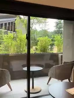 The hotel is about a 5-minute drive from Karuizawa Station, and it's also just a 20-minute walk, making it an excellent location! Surrounded by the serene nature that Karuizawa is known for, the setting is incredibly charming, and the atmosphere of the lobby was wonderful. It felt as if we had come to a private villa, offering a sense of calm, and the guest rooms were tastefully designed. ✨