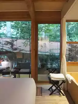 I stayed in a one-room accommodation, and the hinoki cypress bath was incredibly relaxing. Although the room was compact, it was spacious enough for two people.