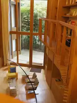 Designed by Shigeru Ban, the hotel boasts captivating architecture. The shared library space features a curated selection of 200 books, which guests are welcome to bring to their rooms and enjoy.