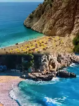 Most famous near Kaş, nestled between steep cliffs, 💧 turquoise waters, fine sand, 📸 great for photos/swimming.