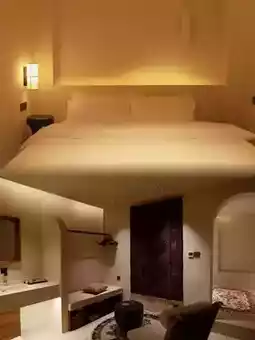 In the suite, traditional hollowed-out gypsum floral walls naturally separate the sleeping area from the tea room. The earthen kang bed is covered with handmade mulberry bark paper mats, and a rawap instrument hangs above the bed as decoration. The bathroom space cleverly incorporates modern underfloor heating, allowing the ancient "abdast" (water vessel) to coexist harmoniously with contemporary facilities.