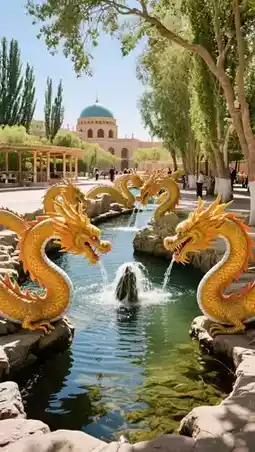 Highlights: Watch the opening ceremony of the town (daily at 10:30 and 18:00, with drums and music, dancers welcoming guests). Stroll along Wustang Boyi Road, hear the clinking of copper shops, see colorful flower hat stores, check in at Jiulong Spring, Areya Road, and popular alleys (reservations available). Visit a century-old teahouse (tea fee 15 RMB, experience Uyghur elders drinking tea and playing instruments).