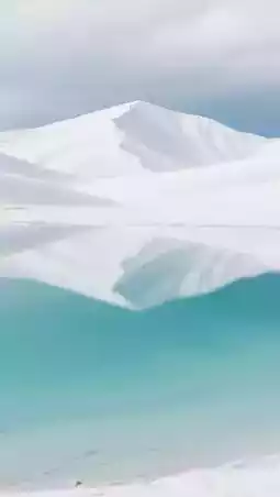 White sand like snow, lake water deep blue, Muztagh Ata Peak reflected in the distance