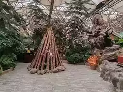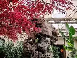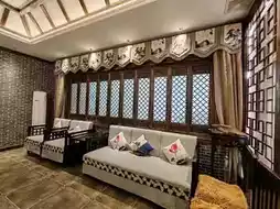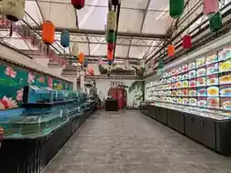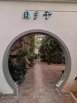 Amidst the surrounding modern high-rises, "South Village" stands out with its distinctive architectural style and landscape. Stepping through the circular gate designed in the manner of a Jiangnan water town feels like traversing into a lush indoor garden. Winding paths lead to serene spots, dense vegetation surrounds the area, and exquisite pavilions and towers can be seen throughout, alongside introductions to classical Chinese culture. The indoor dining area is adorned with colorful lanterns and rows of screens displaying menu items, creating a vibrant atmosphere that showcases the unique charm of blending traditional garden aesthetics with modern dining.