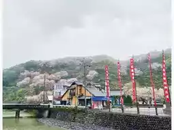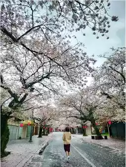 - 💮🌳 The path to the shrine is full of cherry blossoms that are in full bloom, very beautiful