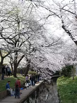 If you enjoy picnicking, this is the perfect place — many people bring food, and you’ll even find dogs enjoying the surroundings. The river, with its long stretch of cherry blossoms, is stunning under the blue sky, and the cascading sakura fit the perfect image of Japan's cherry blossoms.