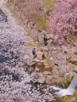 Stand on the stone bridge to capture a layered shot of the stream + cherry blossoms — absolutely stunning! 🌸🏞️