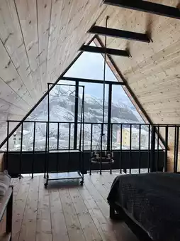 On my fourth day in Georgia, I went to Kazbegi and stayed at Kazbegi Story. Their mountain-view wooden loft villa offers breathtaking snowy mountain views through the floor-to-ceiling windows ❄️