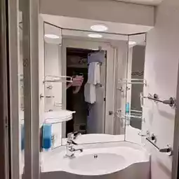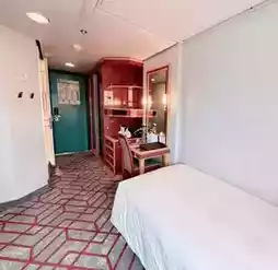 Stepping into the twin bed ocean view room on the Explorer Dream for the first time, I was immediately captivated by the stunning scenery outside the large window! Inside the room, two comfortable single beds are positioned on either side, leaving a walkway in the middle that ensures the space doesn't feel cramped. The wooden furniture paired with warm lighting adds a cozy touch to the ambiance.
