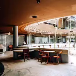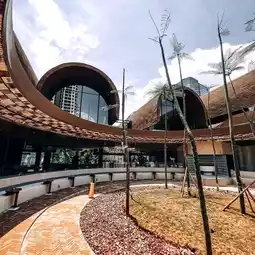 The stunning design starting from its unique façade to its beautiful minimalist interior combined with tropical vegetation around it. The seating area is very spacious, there are two indoor floors and a cozy and warm semi-outdoor area. The facilities are also quite complete, there are private meeting rooms, amphitheaters, prayer rooms, arcade games and later there will be a 3-kilometer jogging track that surrounds the lake behind it.