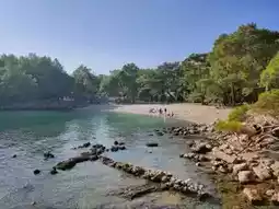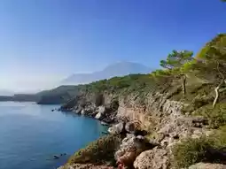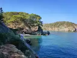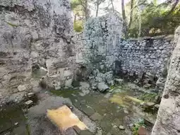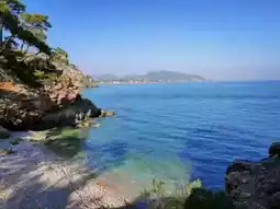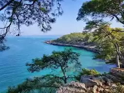 The whole area is super quiet and peaceful, not too crowded, and the pine trees give it this dreamy vibe. You can explore the old stone paths and columns, then walk a few meters and you’re at a beautiful bay with crystal clear water.