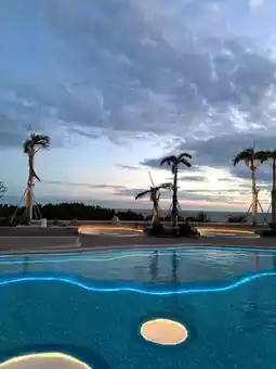 The whole sunset glows with the blue light of the swimming pool quietly shining