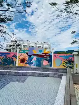 There's also a swimming pool inside, but it seems unused. Perhaps it's only open during summer. As for the interior of the villas, we're not sure. However, considering the convenience of the location, I personally wouldn't choose to stay here 😂. That said, the room rates aren't too outrageous, with weekday prices currently around 2,000-3,000 TWD per night.