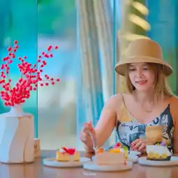 There are food, drinks and bakery services. And there is also a beautiful photo corner. Cafe lovers, those who like taking photos, come to visit Khanom and come to this shop.