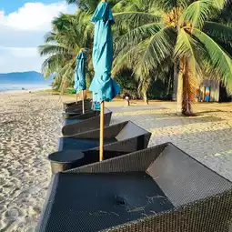 🏩 Today, I'd like to share my experience staying at "Khanom Sea Beach Resort," in a casual, conversational style, like a casual coffee break by the sea. Honestly, if you're looking for a beachfront resort with a peaceful, uncrowded atmosphere, but still want all the comforts you need, this is the perfect place for a truly satisfying getaway. Let's start with the location. Khanom Sea Beach Resort is located right on Khanom Beach, just a few steps from the water. When you open the curtains, you'll be greeted by a clear sea view, a cool sea breeze blowing all day long, and the gentle sound of the waves is a true treat. And in the evening, the sunset is truly stunning! Sitting on the balcony with a cool drink in hand is truly awe-inspiring. The resort's decor is simple yet lovely, accented by a white and blue color scheme that complements the sea. The spacious rooms offer both garden and sea views, and are fully equipped with all the amenities you'd want to wake up for. At night, the gentle sound of the waves will lull you to sleep soundly. For families or groups, they also offer spacious bungalows. There is a swimming pool in the middle of the resort for you to enjoy swimming or just a few steps to the sea. The resort also has its own restaurant that serves spicy southern Thai food and fresh seafood from local fishermen. The taste is very good, especially the "Stir-fried Shrimp with Shrimp Paste and Stink Beans" and "Fried Sea Bass with Fish Sauce" dishes. I give them a thumbs up. The atmosphere around the resort is shady, with coconut trees lining the beach. You can stroll along the morning and evening. For those who love taking photos, there are many beautiful spots, such as wooden swings, picnic tables by the sea, and a small wooden bridge extending into the water. It is a spot that everyone must stop and take photos. In conclusion, Khanom Sea Beach Resort is a place that truly meets the needs of those who want to relax. It is quiet, has beautiful views, and has a warm atmosphere like staying at a friend's house by the sea. It is suitable for couples, families, or those who want to recharge. If you have plans to visit Khanom, give it a try. You'll find that the Southern Sea doesn't have to be extravagant to be incredibly charming. 💙🌴