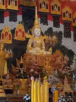Sacred Objects: Inside the ubosot (ordination hall) is a white jade Buddha image in imperial attire, the largest jade Buddha image in the eastern region. There is also the Wihan Luang Pho Mai (vihara Luang Pho Mai), which houses a century-old wooden Buddha image.