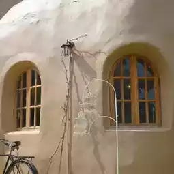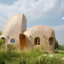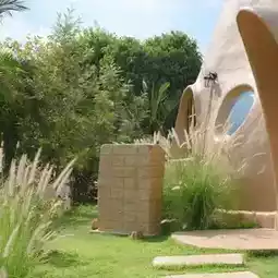 The building is designed as a "clay house" in earth tones, with a fairy tale house vibe. The curved shape makes us feel like we've escaped into a fairy tale world.