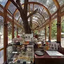 The path to the cafe requires you to walk through a mysterious tunnel with a world map and a treasure chest. When you walk into the shop, you'll be amazed by the Glass House, a classic wooden glasshouse under a large tree, surrounded by trees and pine trees. Oh my... it's as beautiful as a house on Pinterest. The vibe is just too good. 🧺 If the weather were a little cooler, with warm sunshine, it would be perfect for a slow day! 🌤