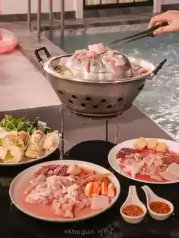 🍳 Complete kitchen and dining equipment: Poolside table and chairs, complete with a BBQ stove and shabu pot.