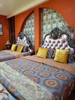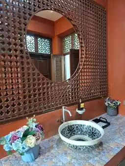 📍This bright orange house is a two-story, three-bedroom house that can accommodate 8 people. It features a dining room with a fully equipped karaoke set. Each bedroom is beautifully decorated in a Moroccan style. There's a separate kitchen outside the house, complete with all the necessary kitchen equipment. We booked this through the Trip app for around 10,000 baht, as it was a long holiday. However, compared to what we received, it was quite good.
