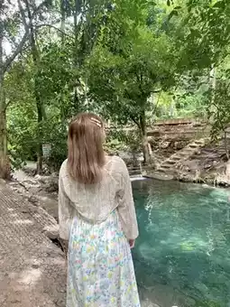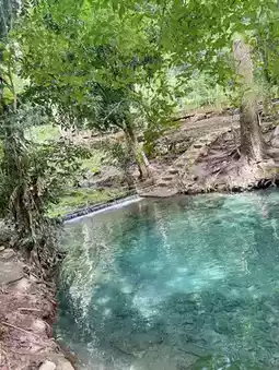 You can clearly see the sand below, along with schools of small fish swimming naturally. 🐠 The surrounding area is shady with many large trees, creating a cool and refreshing atmosphere, perfect for relaxing and cooling off. Or, you can even swim in the crystal-clear water for a truly satisfying experience. 🏊♀️