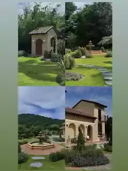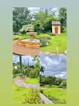 This cozy cafe features a warm, inviting atmosphere and a small fountain in a lovely garden with mountain views.