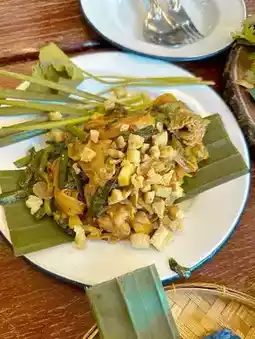 Grilled chicken stir-fried with noodles and pad thai (Thai noodles).