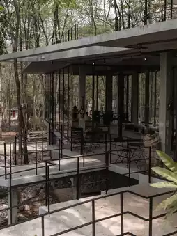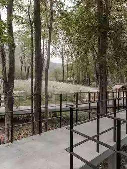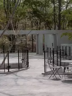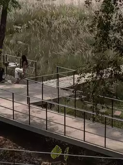 I love the design here. They've created a cafe that blends in perfectly with nature. The front features swaying grass, while the shop is nestled amidst gray-toned trees and large, open windows. Behind the shop is a rocky mountain cliff, connected by a simple concrete bridge, which creates a very calming atmosphere.