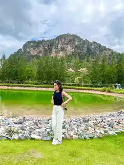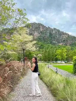 A 180° panoramic view of "Eko Mountain," featuring a pond, a grassy area, and surrounding mountains. The airy atmosphere is perfect for those looking to escape Bangkok – come hang out, relax, and enjoy the breeze. You'll want your friends to be envious, saying, "Wow, what a view we're standing in!"