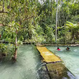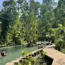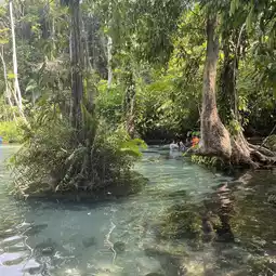 This is one of the most popular tourist destinations in Surat Thani Province, attracting both locals and visitors who come to admire the crystal-clear beauty of this natural spring. The site features a freshwater pond with a bluish-green hue, approximately 1 meter deep. The pond's bottom consists of sandy limestone sediment, which keeps the water clear and pristine at all times.