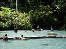 Ban Nam Rad Watershed Forest, located in Khiri Rat Nikhom District, Surat Thani Province, is a crystal-clear, blue-green freshwater pond. The pond's bottom is made of sand and limestone sediment, preventing turbidity. The surrounding area is lush and green with trees.