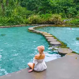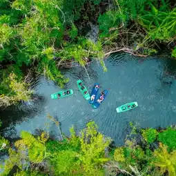 There are restrooms, restaurants, and kayaks available.