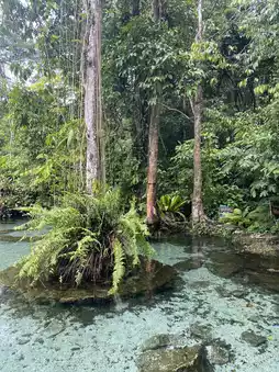 OMG! If you visit Surat Thani and don't come to Ban Nam Rad Watershed Forest, you are seriously missing out! This place is a true paradise for nature lovers! 💚 The water is incredibly clear, cool, and a beautiful emerald color. You can see the fish 🐠 and the sandy bottom so clearly—it's like a natural swimming pool in the middle of the forest! 🌳 (You can clearly see people swimming in the clear water in the top left photo!)