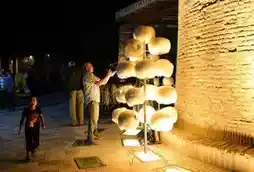 As night falls, the ancient city's brick towers and arched buildings are gently illuminated, and the old bazaar is still bustling with people. Tourists browse local handicrafts under the lights, as if traveling back to the prosperous days of the Silk Road~