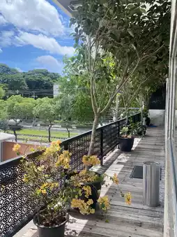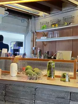 A healthy smoothie bar in the Khlong Toei area. The small shop has seating for 5-10 people. The atmosphere is pleasant, decorated in wood tones and lush greenery, creating a refreshing and pleasing atmosphere.