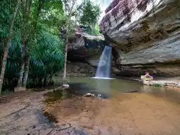 Saengchan Waterfall or another name is Namtok Long Ru, originating from Stream Ta Long. The origin of the name Saengchan Waterfall is named after the waterfall that sprinkles mist through the rocks. It is a soft white color similar to moonlight. Especially at midnight, the moonlight will shine into the holes in the rocks and release the waterfall that sprinkles beautifully. The holes in the rocks are caused by water erosion. Because sandstone is not very resistant to erosion, it is a natural phenomenon that is perfect for sandstone and water. #tripแจกโรงแรมฟรี #น้ำสะเก่น