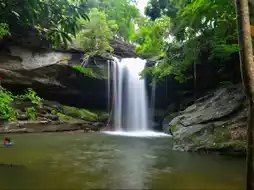 Tham Puang Waterfall is a waterfall formed by the gathering of water from high places, flowing down from a cliff, which is a rocky outcrop, to the ground in the Tham Puang area, located in Ban Na Bua, Tambon Huai Yang, Amphoe Khong Chiam, Ubon Ratchathani Province. It is a waterfall that relies on flooding during the rainy season until November. To get there, take route 2222, turn left at Ban Nong Khong-Ban Na Bua until you find the entrance. Walk along the path until you find the waterfall. #tripแจกโรงแรมฟรี