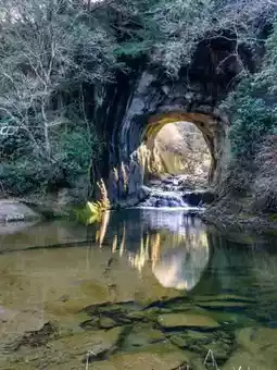 Nomizo Falls in Kimitsu City, Chiba Prefecture, is a fantastic spot where the morning sun shining into the cave reflects on the water surface, creating a heart-shaped light.