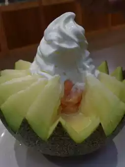The melon soft serve, available for only 2-3 weeks, varies in price depending on its size 🍈. Topped with premium soft serve on juicy melon, it's a luxurious treat you must try at least once in your life ✨