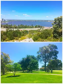The spectacular view often used in Perth's tourist magazines is taken from Kings Park, located on a hill near the city.