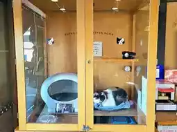 The building is so adorable, with cat ears on the roof. Upon arrival, I immediately went to meet the stationmaster, a cat. He was sleeping comfortably in a warm cabin, as it was freezing outside.