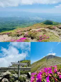- Mount Takachiho: Located on the border of Miyazaki and Kagoshima prefectures, the Takachiho River Gorge Visitor Center at the foot of the mountain has a wealth of information, including terrain models. The mountain slopes have terraced rice paddies and tea fields, and the mountainside is a reddish-brown cliff face. The color of the peak varies at different times of the day.